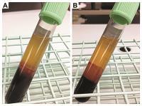 Suboptimal centrifugation of samples causes poor separation of plasma or serum from cells. Inadequate centrifugation results from insufficient speed or time spinning, or failure of the centrifuge. Figure 1A shows a gel tube that was centrifuged at a speed lower than the manufacturer’s recommendation. Clearly, there is poor separation of the red cells from the plasma. Figure 1B is of a gel tube spun for less than the recommended time. There is extensive penetration of cells throughout the gel, and though difficult to see in the picture, cells appear to be on top of the gel as well.