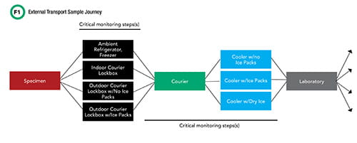Worldwide, healthcare institutions continue to expand their outreach programs. As a result, higher volumes of laboratory samples routinely travel from offsite clinics to centralized, core clinical laboratories for testing. External sample transport involves many individual steps before samples reach the laboratory for analysis (Figure 1). Along the way, a sample’s journey passes through two critical phases, beginning with staff at the offsite physician office or outpatient clinic collecting the patient sample, processing it, and placing it inside or outside of the clinic for courier pickup, depending on the facilities’ hours of operation. After a clinic closes, samples are routinely placed inside an outdoor courier lockbox for off-hours access.