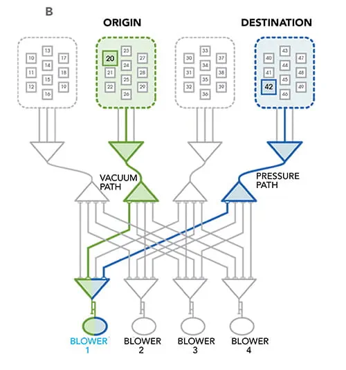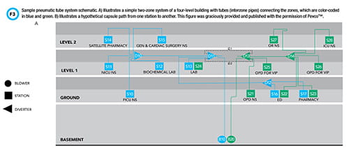 Pneumatic tube systems are an integral feature of most healthcare institutions and enable safe and efficient transport of clinical samples for centralized testing. A schematic drawing of a basic pneumatic tube system is depicted in Figure 3. These systems use a network of pipelines to transport capsules, also known as carriers, from one point to another.