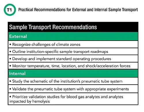 With the largest proportion of errors in clinical laboratory testing attributed to the preanalytical phase, mitigating the negative impacts of sample transport represents an opportunity to improve the quality and accuracy of laboratory testing. The first, and perhaps most important, step of implementing meaningful interventions is the ability to identify and quantitate the effects of various transport modalities. Table 1 outlines several recommendations for the assessment and measurement of the effects of both external and internal transport on samples. Once identified, laboratory leaders can implement appropriate mitigation strategies and monitor them for effectiveness.