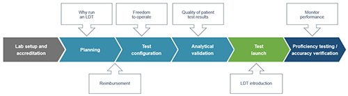 One of the first steps to plan the development of an LDT is to define the testing needs, followed by an assessment of commercially available IVDs. If no appropriate IVD test is available, the laboratory needs to assess technical feasibility and draft a development plan to define the intended use of the test and the assay design. A freedom to operate analysis should be performed to understand the intellectual property landscape and identify potential patent infringement issues. It is equally important to review and plan reimbursement strategies early on to ensure the efforts and costs of LDT development will be worthwhile.